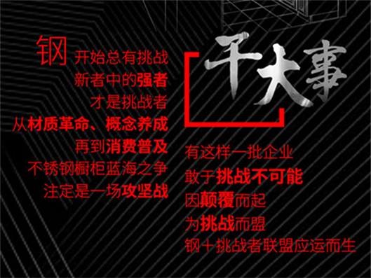 因顛覆而起,為挑戰(zhàn)而盟。10月30日,中華櫥柜網(wǎng)“鋼+挑戰(zhàn)者聯(lián)盟”正式起航,記者團一行來到聯(lián)盟首站——法迪奧不銹鋼藝術廚柜。【詳細】