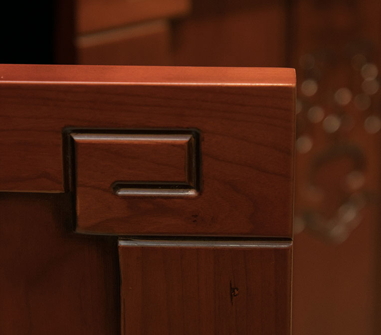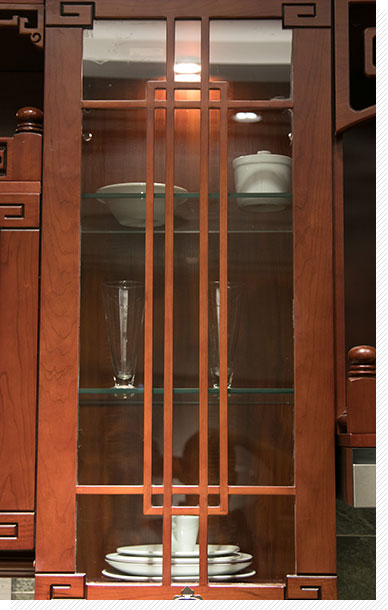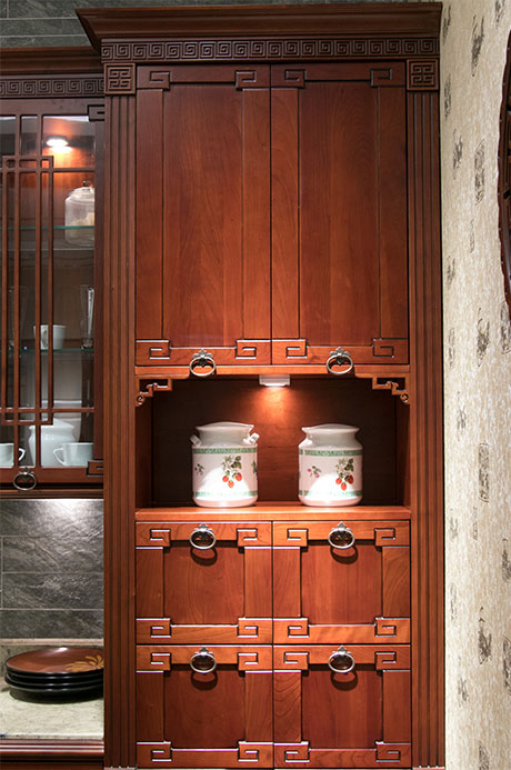 典雅古樸的鏤空花窗,具有分隔空間、透風(fēng)透氣等多種功能,點(diǎn)綴了整個(gè)櫥柜,具有非常強(qiáng)的藝術(shù)裝飾效果。