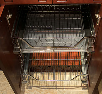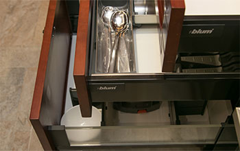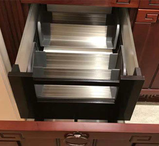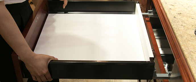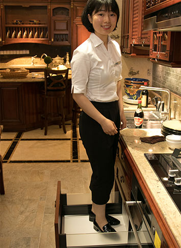 地柜由多個(gè)抽屜構(gòu)成,不同的抽屜可以擺放不同的器皿,查找起來(lái)比較方便。抽屜內(nèi)設(shè)有活動(dòng)夾板,可以根據(jù)物品的大小,自由組合并且隨時(shí)可以拆除,方便對(duì)整個(gè)抽屜進(jìn)行拆洗和清潔,這個(gè)設(shè)計(jì)非常貼心。