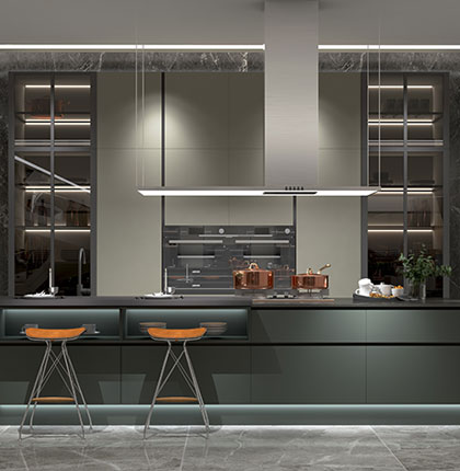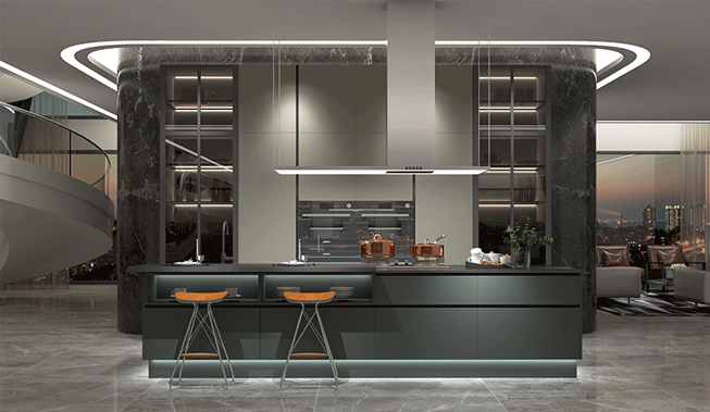 暗夜綠和辛巴克兩款烤漆顏色門板,呈現(xiàn)出低調(diào)奢華的神秘感,在這沉穩(wěn)而又大方的顏色搭配之下探索下廚的樂趣,使生活充滿了儀式感。