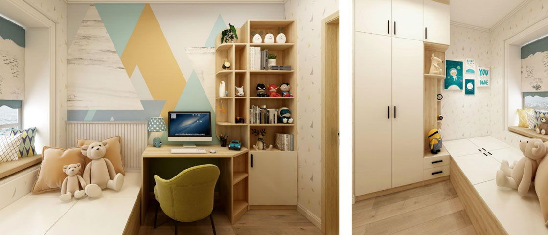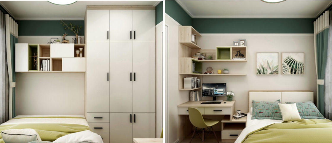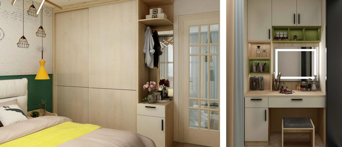 衣柜兼具收納主柜、開(kāi)放隨手區(qū);主臥陽(yáng)臺(tái)可以來(lái)滿足梳妝區(qū)和飾品區(qū)的需求;次臥一體化緊貼設(shè)計(jì),小空間也有大天地。